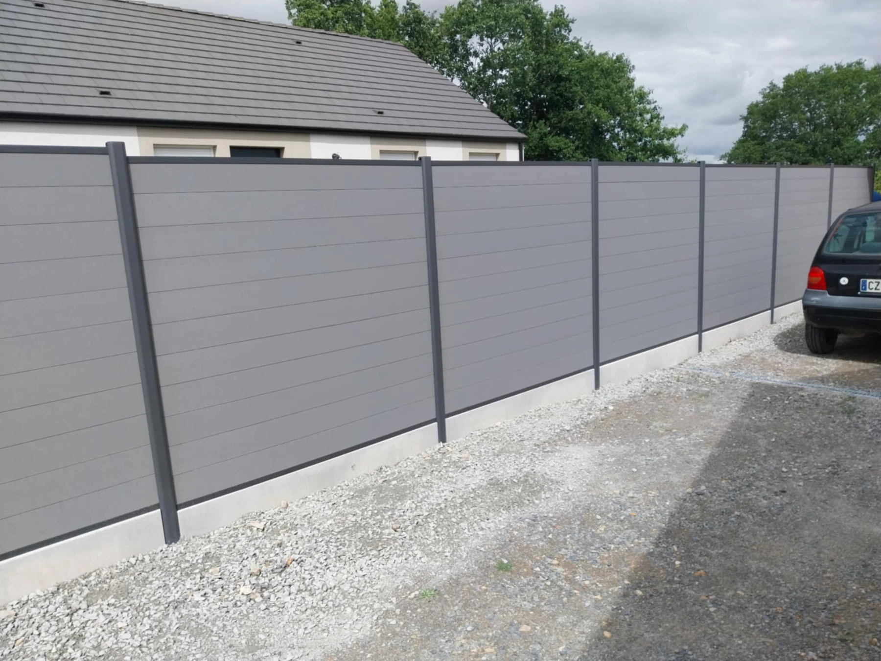 Pose d'une clôture composite TRAUMGARTEN avec poteau alu anthracite, lame grise avec finition haut et bas en alu. Pose avec une plaque béton en soubassement.