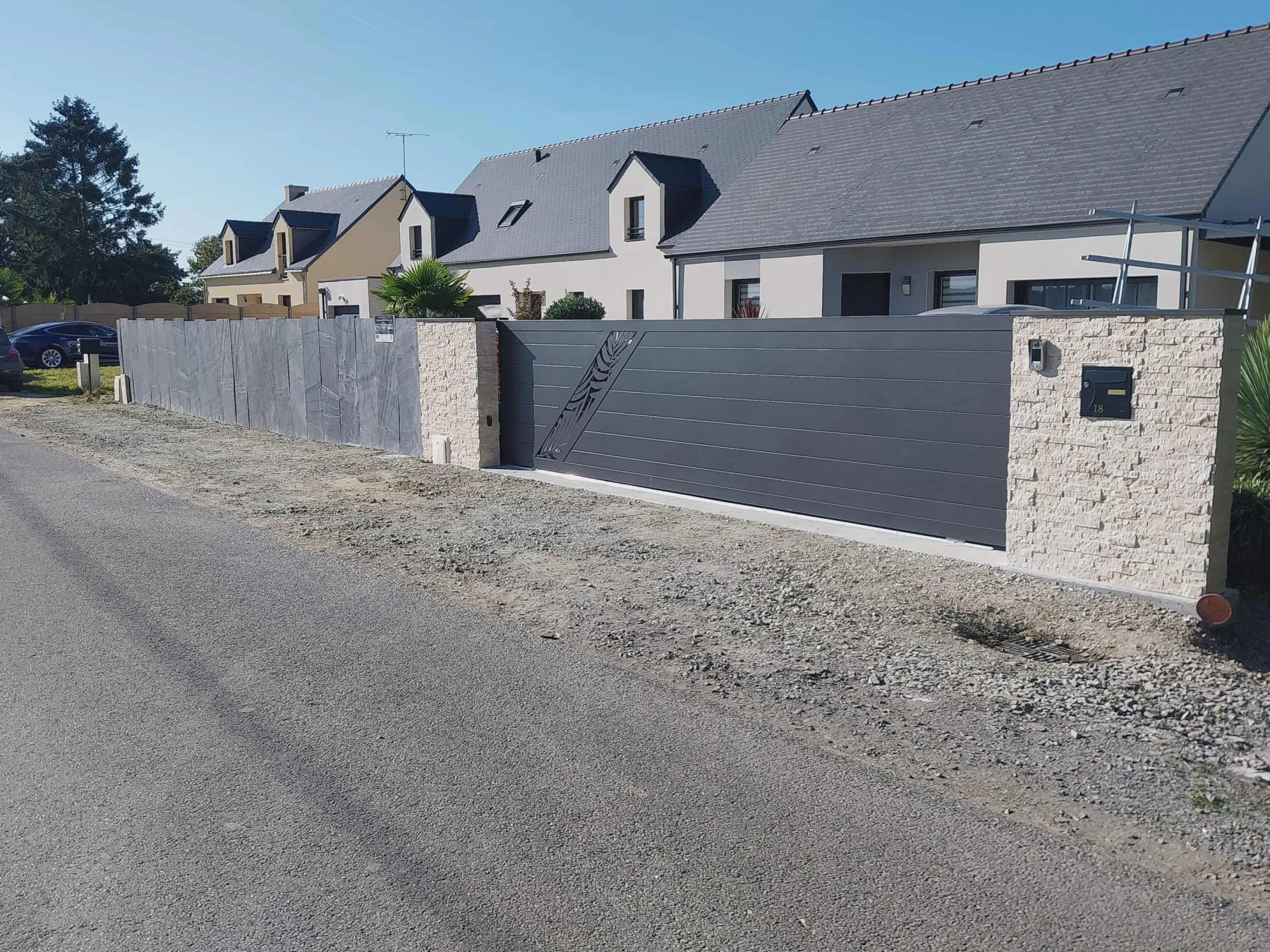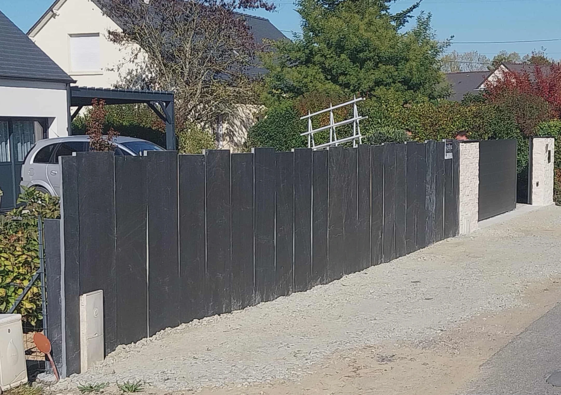 Aménagement d'une entrée de cour avec la réalisation d'une clôture en palis d'ardoise clivée H 1,50.