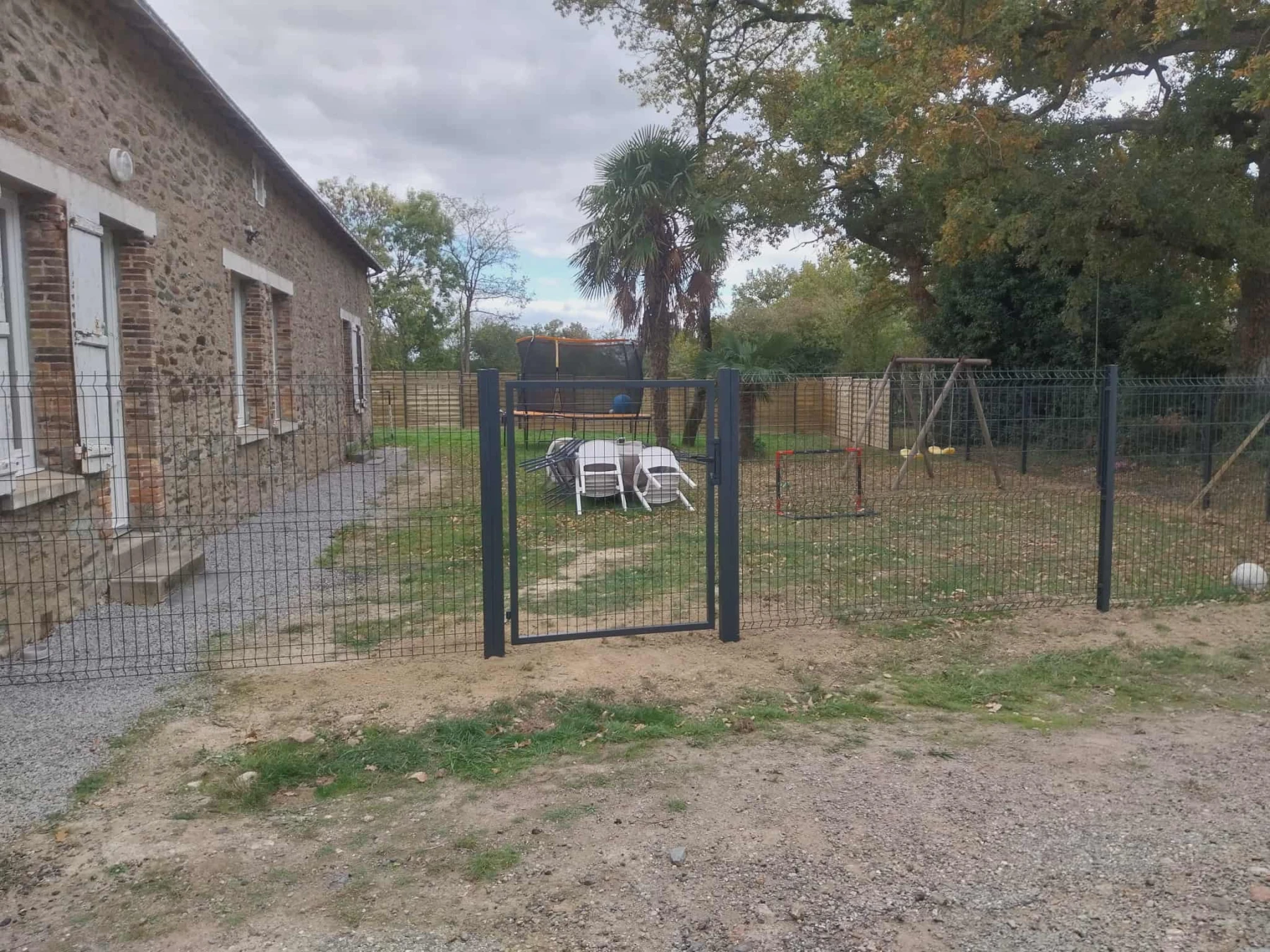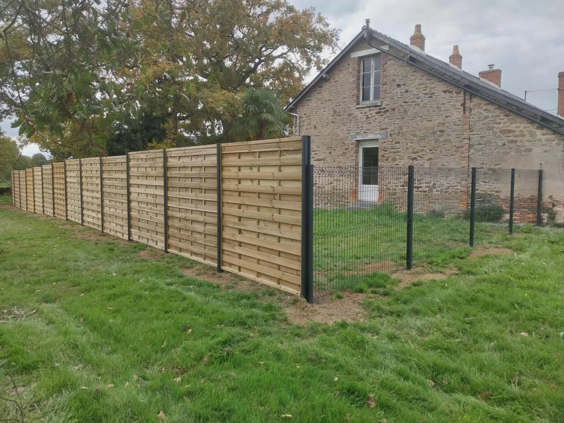 Sur ce chantier pose d'une clôture en panneaux bois avec des poteaux en alu gris anthracite hauteur 1m80 et d'une clôture en grille rigide avec un portillon hauteur 1m53.