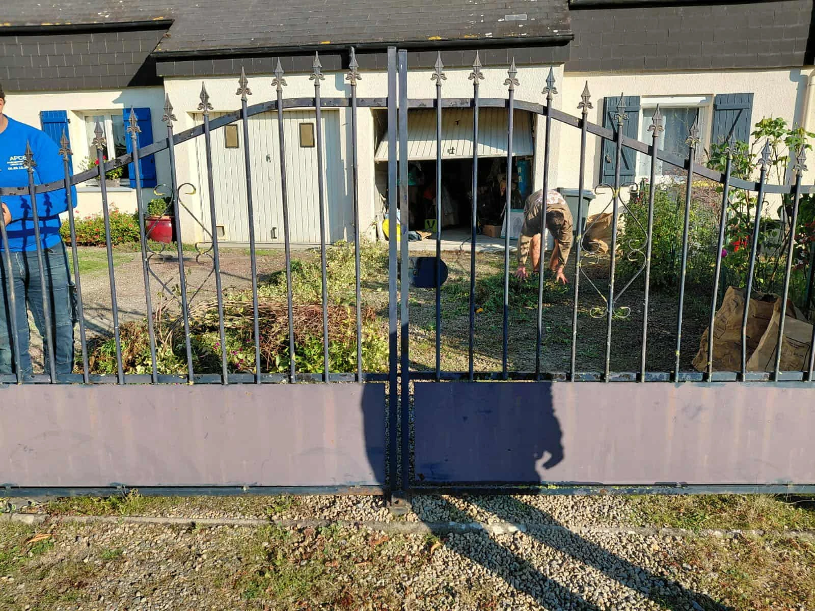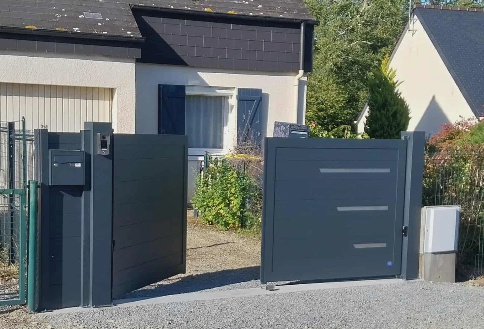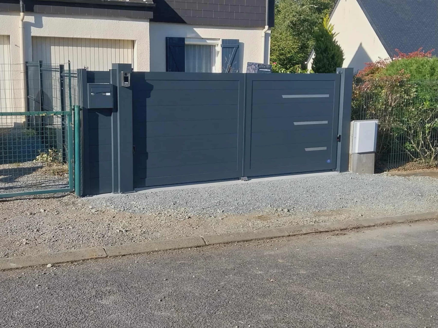 Pose d'un portail battant double vantaux. Portail aluminium soudé, thermolaqué gris anthracite 7016.. 3 bandes déco en inox brossé.