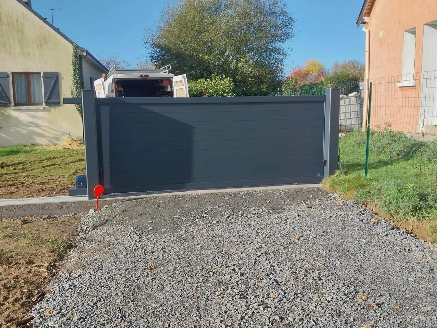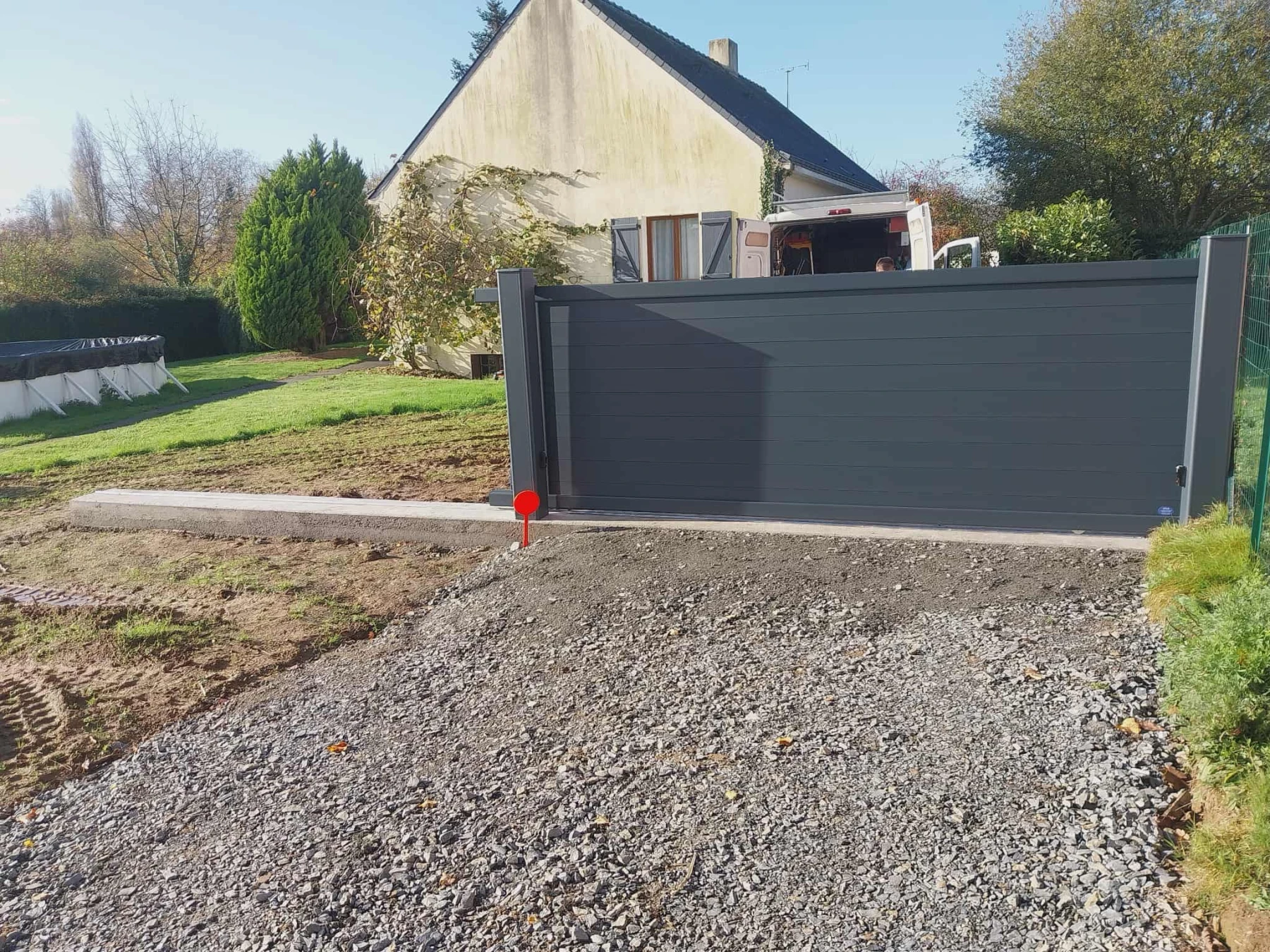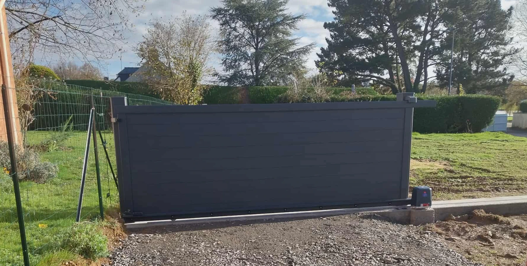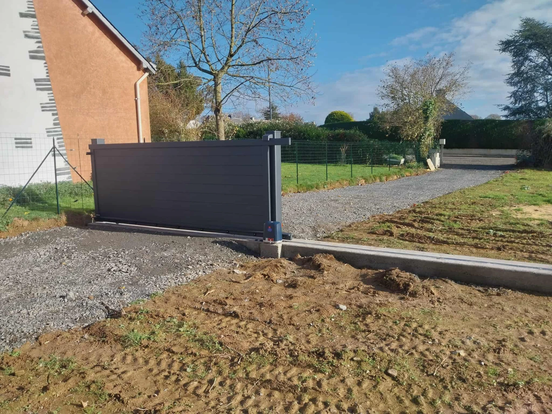 Pose et motorisation d'un portail coulissant. Portail simple, cadre alu et remplissage en lame alu. Hauteur 1m50 par 3m80 de large.
