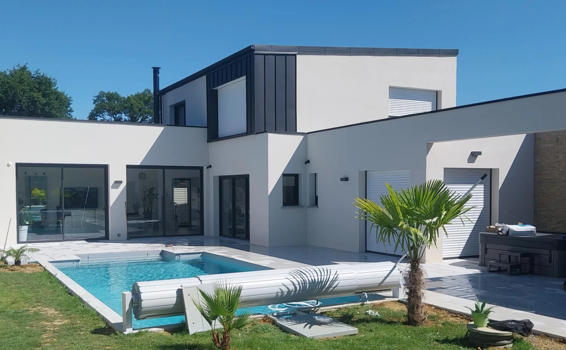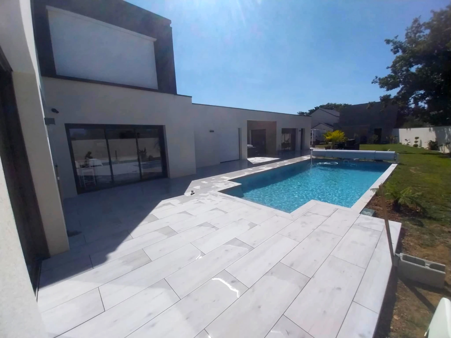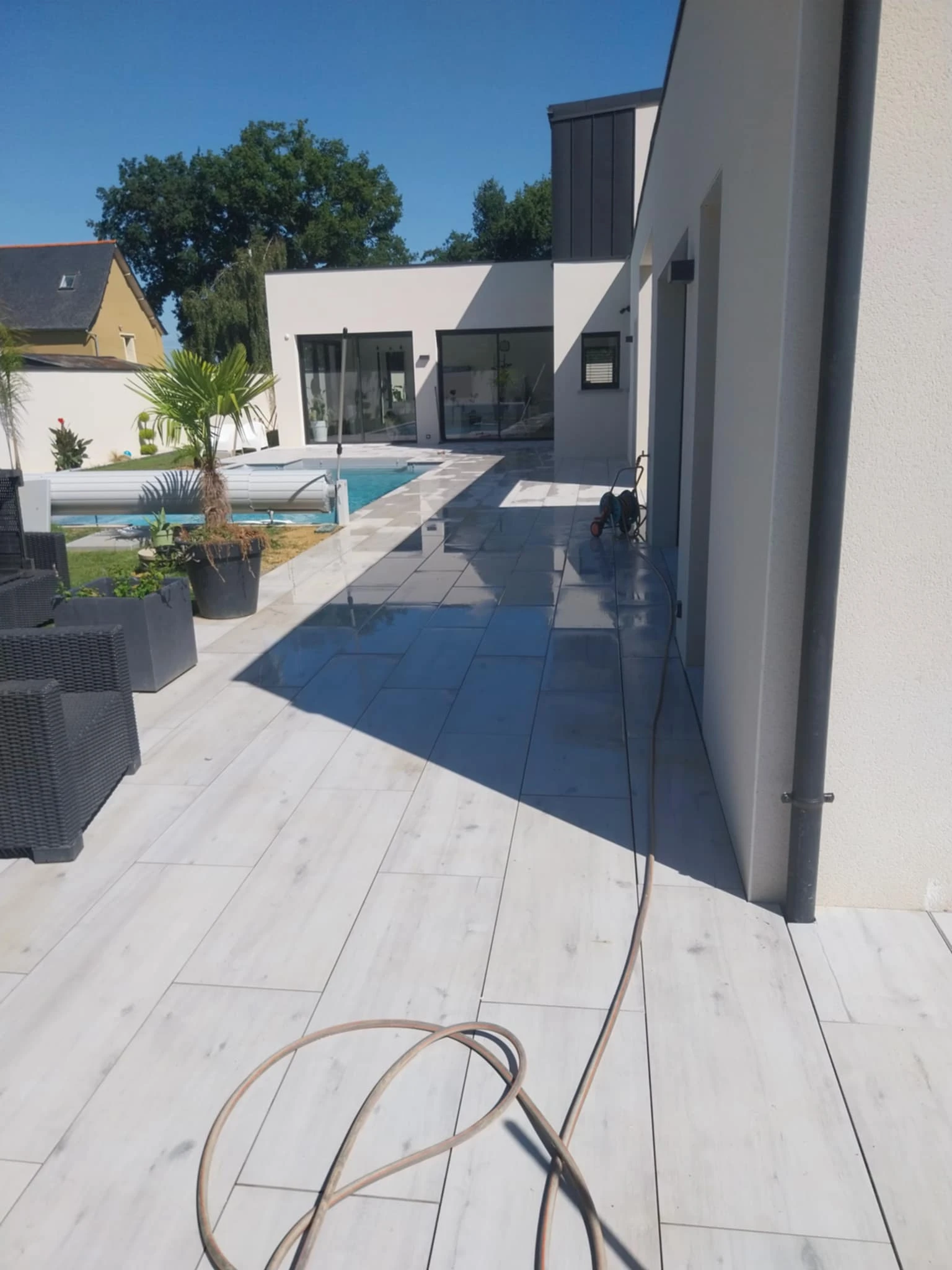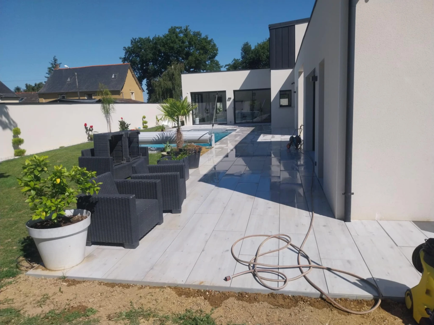 Création d'une terrasse sur plots et des margelles autour d'une piscine. Terrasse d'environ 115m² avec des carreaux 120/40 cm.